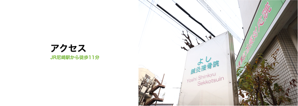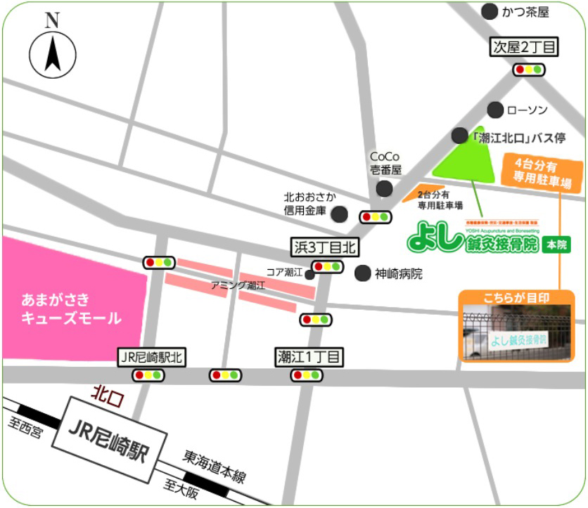 JR尼崎駅北口より出て直進「JR尼崎駅北交差点」を右折、「潮江一丁目交差点」を北へ道なりに進むとY字路が出てきますので、右方向に数分歩くと右手に「よし鍼灸接骨院」があります。