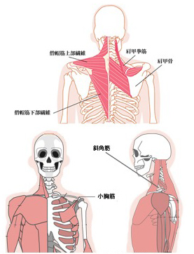 2.肩が前方へ移動することで肩の前方にある斜角筋や小胸筋という筋肉の膨張が続き、それも肩こり、首痛の痛みの原因となり、悪化すれば神経や血管が圧迫されて手に痺れがでる胸郭出口症候群を引き起こすことがあります。
