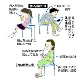 姿勢の悪さからくるもので、最近では「スマホ巻き肩」といわれるほどスマートフォンの使用から不調を訴えるケースが多いです。スマートフォンはパソコンと違って軽くて動かしやすくて、画面が小さいので自分の楽な姿勢で目から近い位置で操作しがちです。