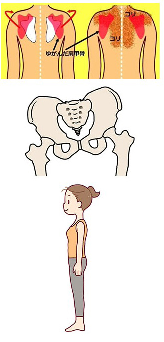 また、巻き肩や猫背を改善しようとする際に背中を内側にただ寄せようと努力される方がいますがそれは間違いです。骨盤を立たせた時(骨盤正常位)に自然と背筋が伸び(椎骨が正常弯曲を築く)肩甲骨が自然と内方により正常な位置に保てるようになることが大切なのです。決して意識して肩甲骨を寄せるわけではありません。